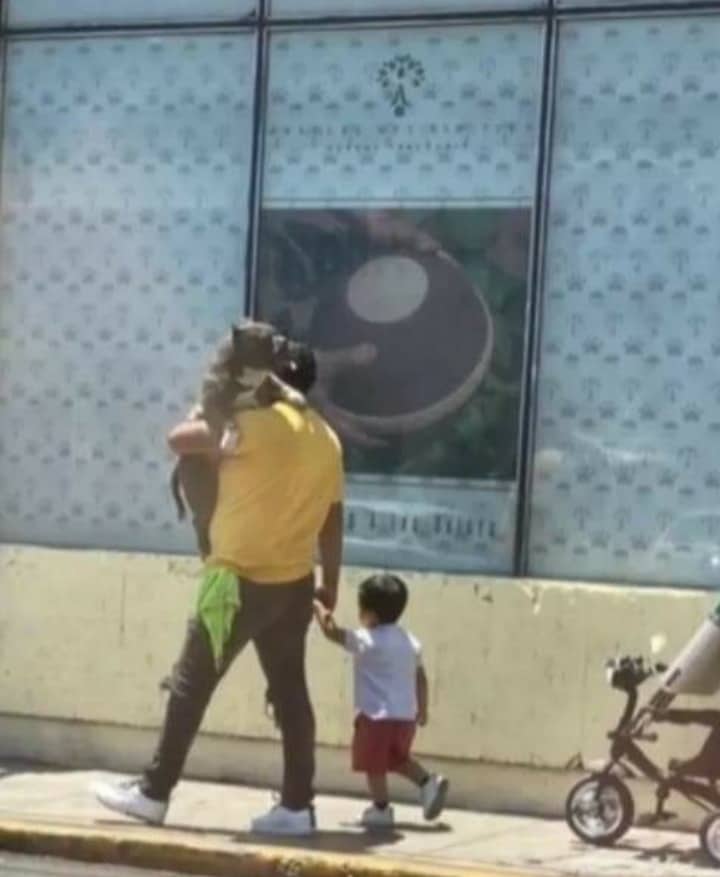 Otra de las conjetura es que el perro haya sufrido alguna lesión que le impedía caminar, el hecho es que él fue quien ocupó un espacio favorecido en los brazos de su dueño mientras su hijo reducido caminaba a su lado.