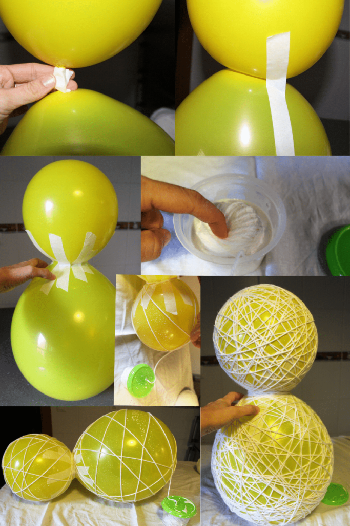 4. Mojamos la lana y la empezamos a enrollar en los globos, muchas vueltas para que tome forma