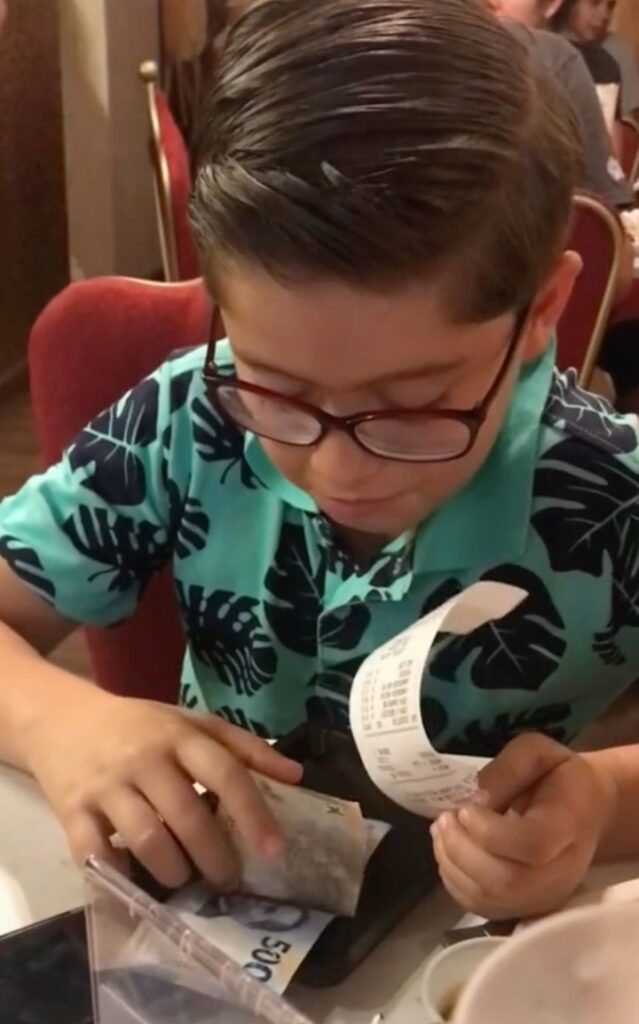 Al final, su padre, al notar que al pequeño no le alcanzaba para realizar los pagos la cuenta, lo ayudo con el monto total de la cena.