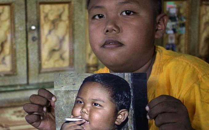 El menor perteneciente de un reducido pueblo de Indonesia fue a lo largo de un largo tiempo dependiente a los cigarrillos. En 2010, cuando se realizó popular, fumaba 40 cigarrillos por día.