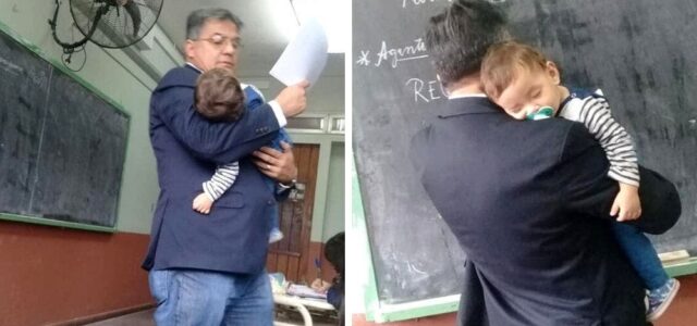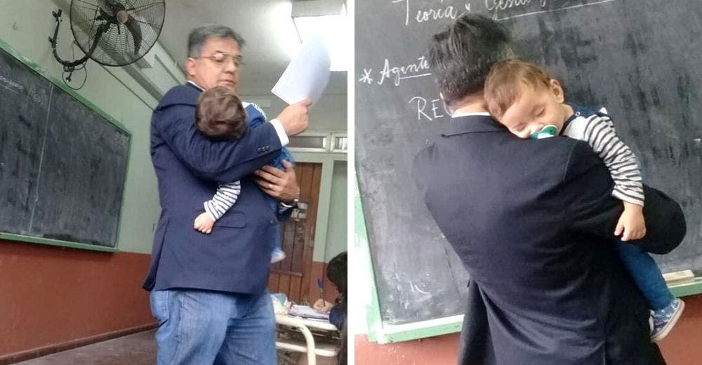 La joven compartió en su cuenta de Facebook una foto donde aparece el profesor Tenreyro, con Pilar dormida profundamente en uno de sus brazos, mientras con el otro sujeta una hoja de la que presuntamente saca contenido para la clase.